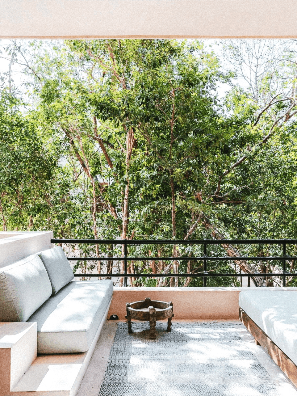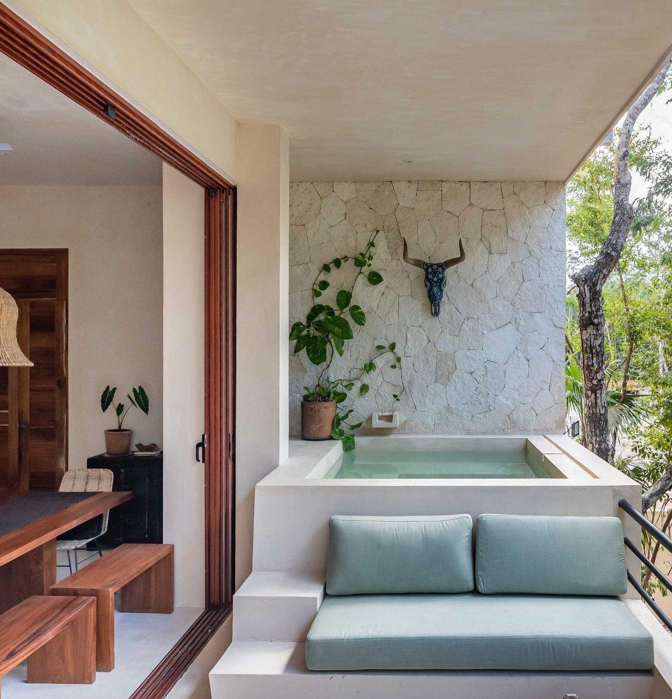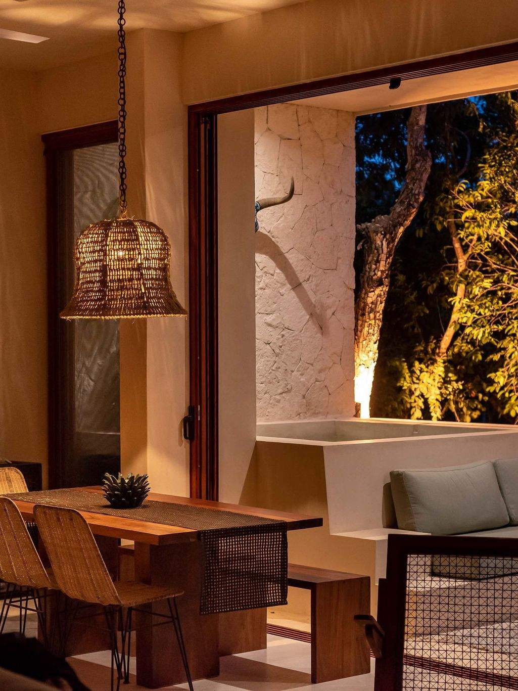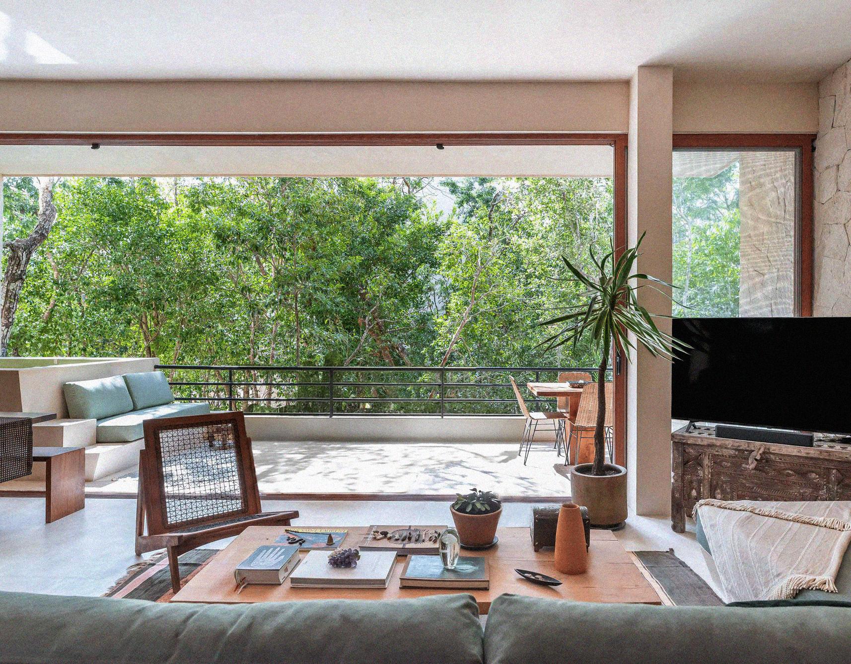 With its generous outdoor area and the large floor-to-ceiling window that opens entirely, the main space extends seamlessly into the exterior. The transition between inside and out becomes almost imperceptible, creating a sense of open-air living that feels both spacious and effortlessly connected to the surrounding landscape.